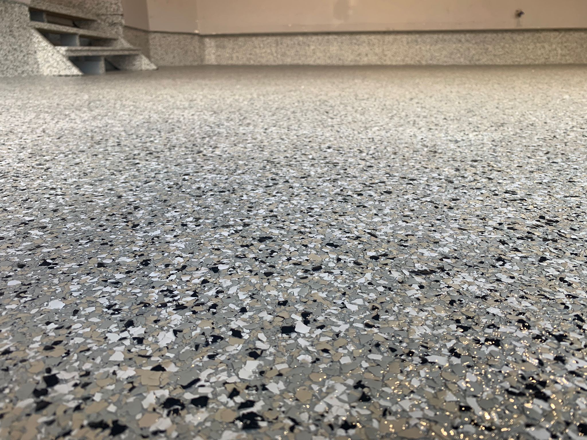 We then apply a base coat of epoxy that forms a flexible and well-bonded floor layer. While the layer is still wet, we broadcast the decorative flakes onto the floor. The flakes come in a variety of colors and you can choose from and provide useful traction for an otherwise smooth poured floor.